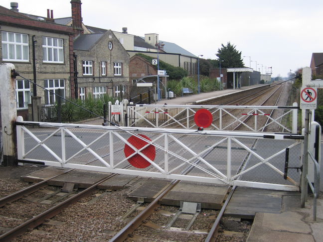 A level crossing, operated by hand from the signalbox at the western end of platform 1, connects the station's two platforms: