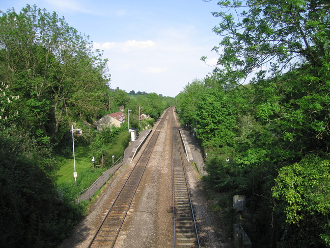 Avoncliff station is a small request stop near the point where the Kennet and Avon canal crosses both the railway and the river Avon on the Avoncliff aqueduct. The station entrance seen from the aqueduct: