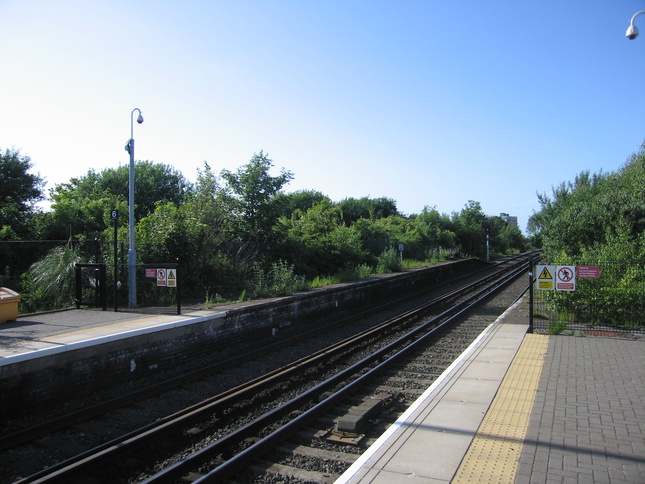 A footbridge crosses the track to the northbound platform 2. The view north from the footbridge: