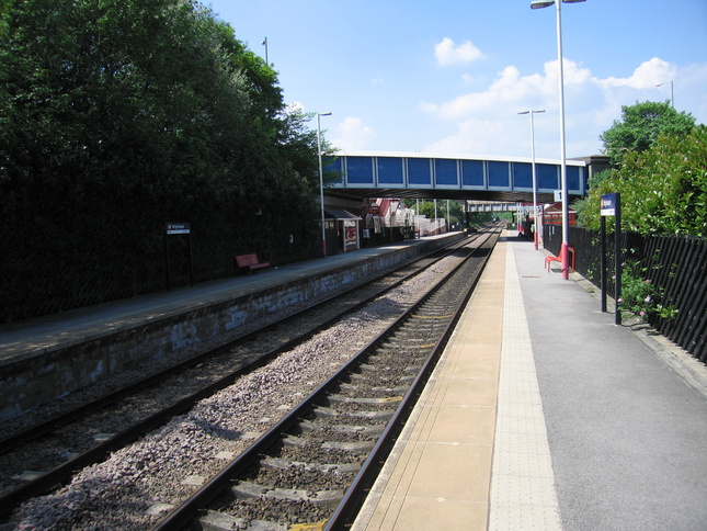 The station lies in the gap formed by two road bridges, Huddersfield Road, in the centre of this picture, and Gooder Lane, from which this overview of the station was taken: