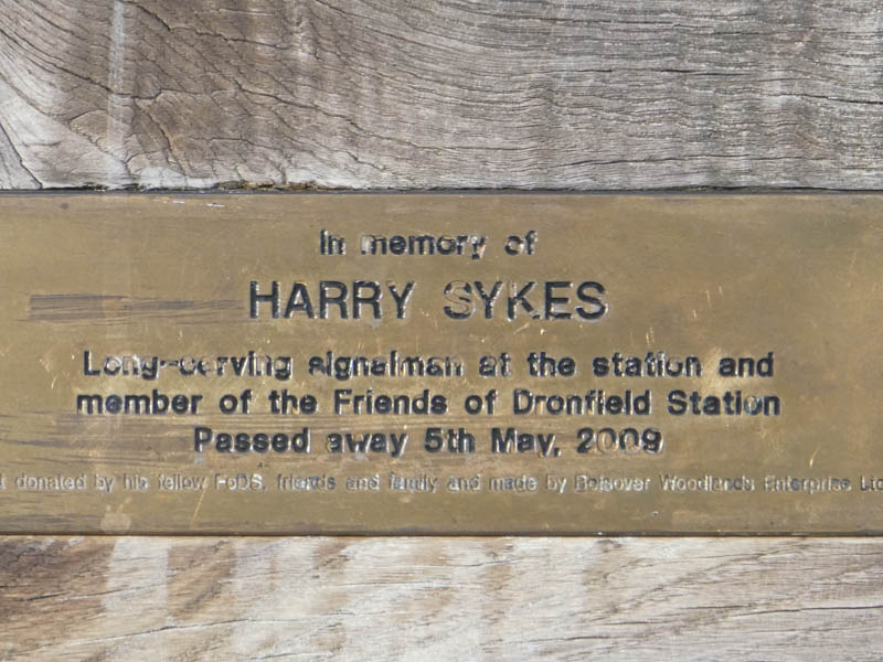 The bench bears a plaque "In memory of HARRY SYKES, Long-serving signalman at the station and member of the Friends of Dronfield Station, who passed away 5th May, 2009":
