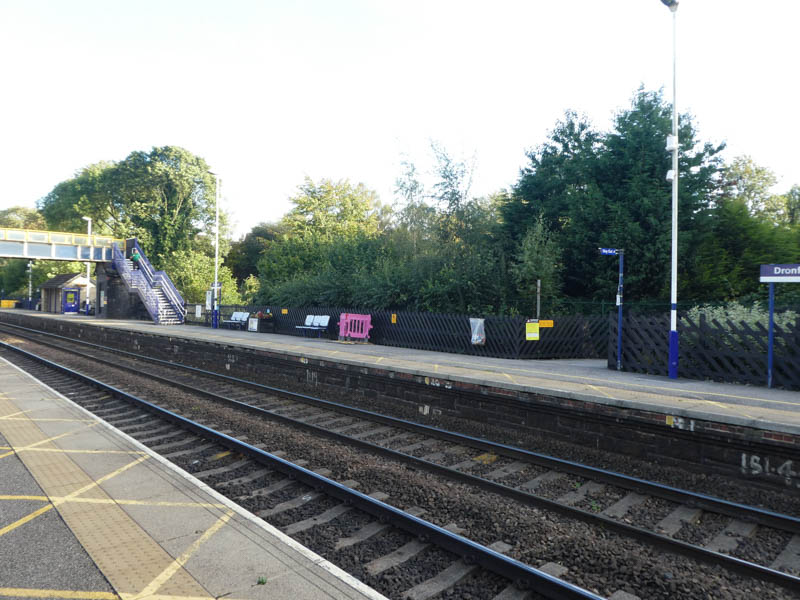 In the car park at Dronfield, with the footbridge on the left and the ramp ahead which provides level access to platform 2 opposite: