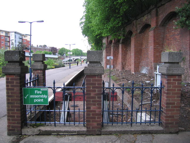 At the east end of the platforms, the line is crossed by a new footbridge, and behind it a road bridge. The zigzag ramp is perhaps supposed to deter cyclists and skateboarders: