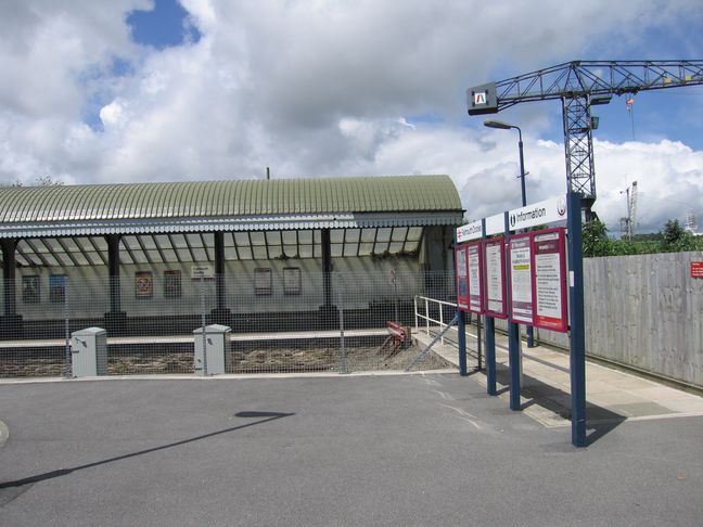 Falmouth Docks is at the end of a well-used branch line from Truro. The station has a modern canopy, seen here from the side: