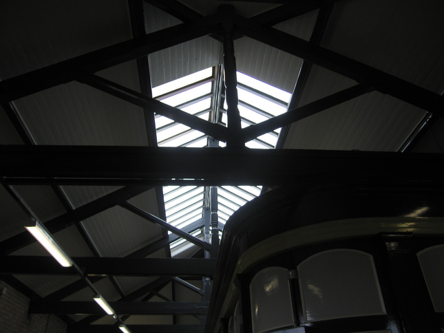 The ticket office is panelled wood and has a painted wood-beamed roof: