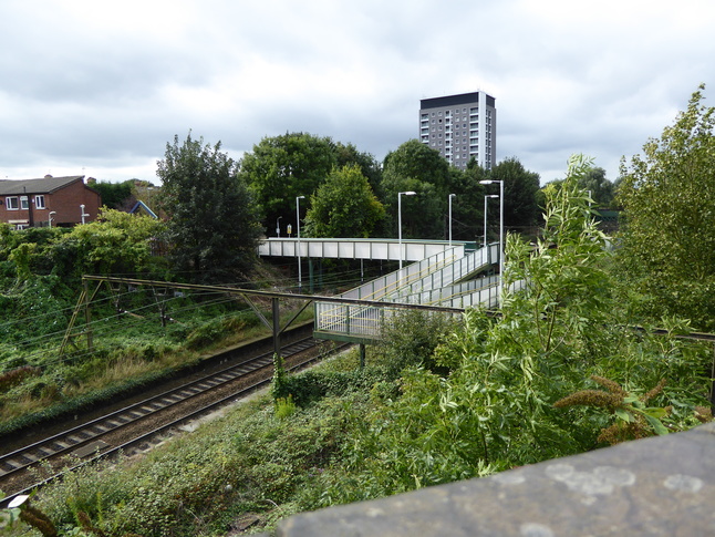 Climbing up the ramped footbridge access we can look at the electrification gantries which date from the station's role as part of the Woodhead Route: