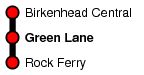 Green Lane station is in Birkenhead, with station buildings at ground level and platforms in a tunnel. The front of the station building on the west side of the line: