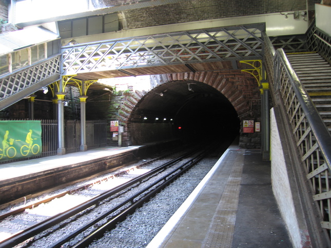 The station is in a tunnel, with half of it open to the sky, and half covered by arches. The arched half is underneath a disused goods line to the Birkenhead docks: