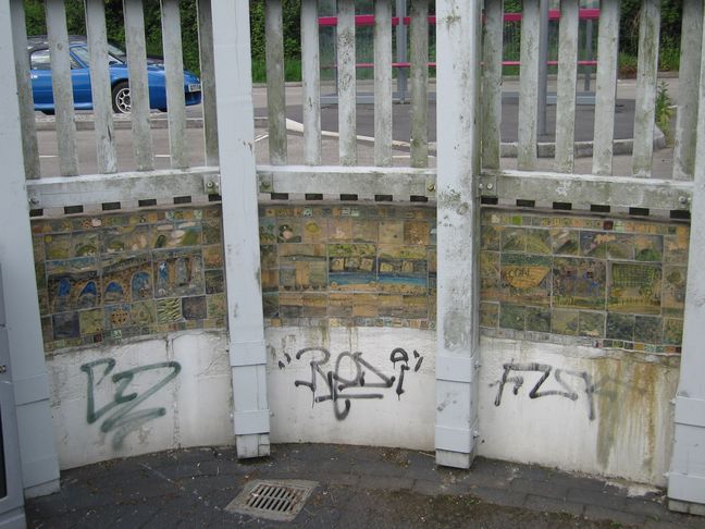 The station wall is decorated with painted tiles showing scenes from the line; in the panel on the left is the viaduct at Calstock one stop along the line: