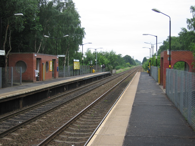 Halewood station is on the Merseyrail "City Line", which seems to be code for the bits of Merseyrail that aren't electrified and are operated by Northern Rail. It's a modern station, with a building at street level and a couple of platforms on an embankment. The station building at street level: