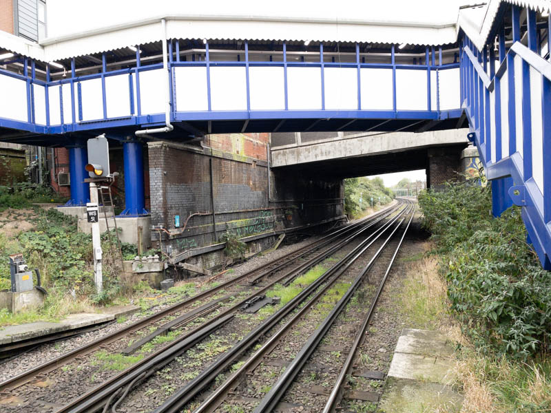 The footbridge, seen from the northern end of the up platform, connecting to the station building just behind: