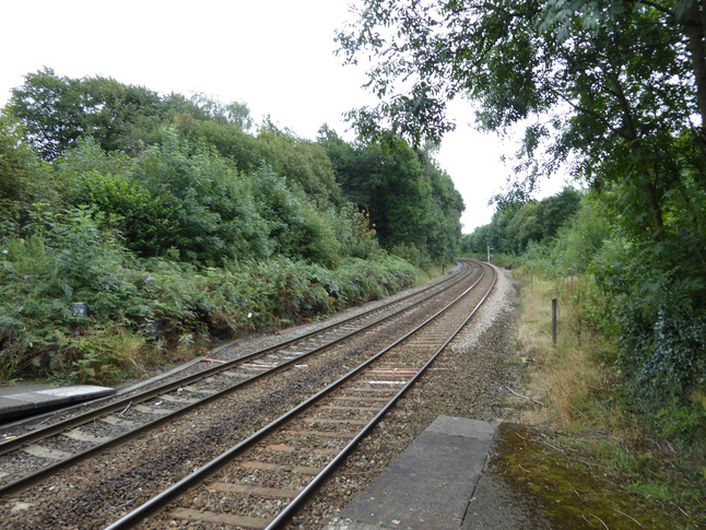 Middlewood station is appropriately enough in the middle of a wood, accessible only by tracks through the woods in the Poynton district of Cheshire. The station was originally two, Middlewood Lower, with the now closed Middlewood Higher station on the overbridge above. Now there is only Middlewood, with the Higher station's trackbed converted to a "linear park" connecting Marple and Macclesfield. The bridge over the extant line has the station's information boards: