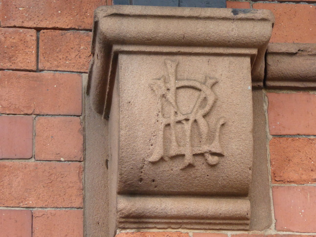 To either side of the entrance archway supporting the canopy over it are two monograms: