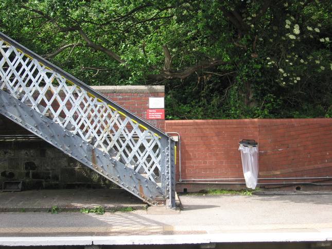 The end of the footbridge on platform 2. A new patch of brickwork shows where once an old exit to the station began: