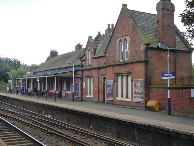 Romiley station serves the Romiley area of Stockport and has platforms elevated above ground level as the line crosses the Stockport Road. The front of the red brick station building, facing onto the road: