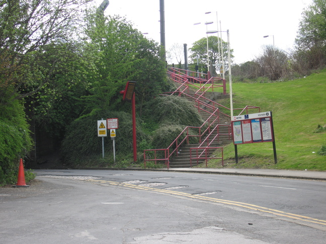 The entrance from Leeds Road, to the north east of the station. The steps lead up to platforms 1 and 2, with the road going under the railway to enter the station car parks: