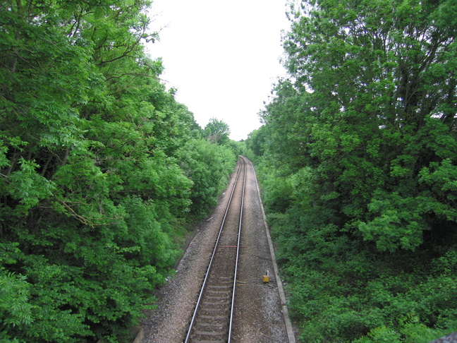 To the east of the station, Hung Road crosses the line. Looking westwards from the bridge towards the station: