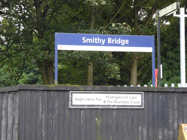 Signs tell us that Smithy Bridge is "for" the Hollingworth Lake and Rochdale Canal: