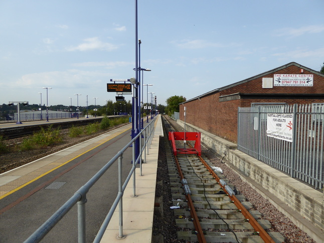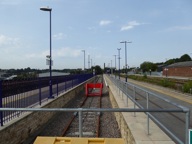 Looking west along platform 4 we can see the buffers of a bay platform on the right, platform 5: