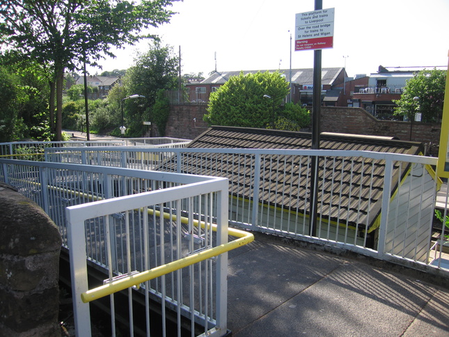 The station is on the line to Wigan, and has two platforms, both accessed by ramps from the road bridge which crosses the line at the station's east. The entrance to platform 1 on the south side of the line: