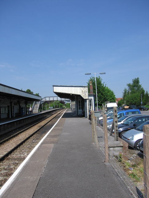 It was a sunny May morning when we visited Warminster, seen here approaching the front of the station's wooden building: