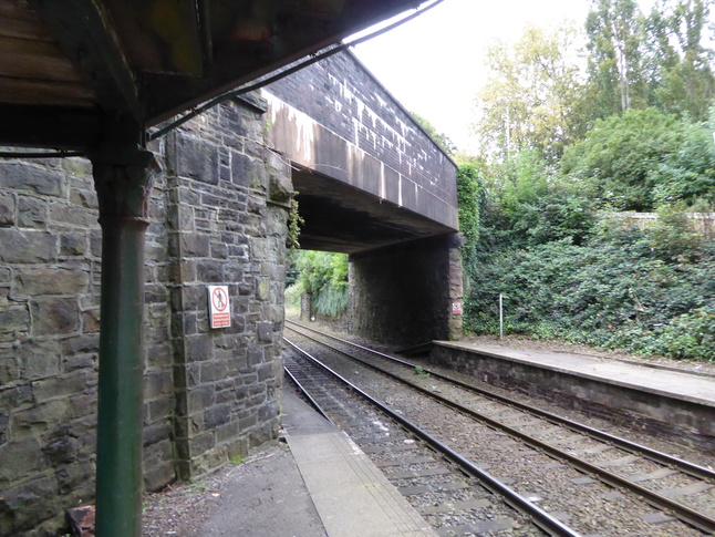 The road bridge crosses the line at an angle at the station's north end: