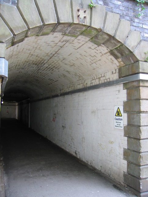 Looking up the ramp, Half-way up, on the right, is the subway leading to platform 2, while the ramp continues up to platform 1: