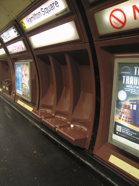 Detail of the moulded brown plastic seats from the 1970s when the current Merseyrail network was institutet. These will disappear when the station is refurbished in the next couple of years: