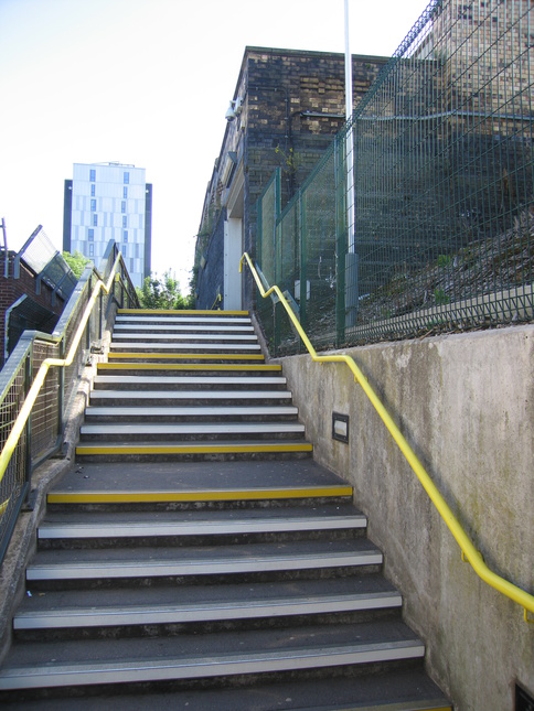 At the top of the steps looking down the ramp to ground level and up the ramp to platform level:
