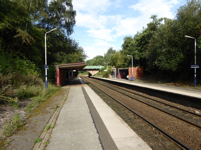 The rear of the Brinnington station building, from where the footbridge heads over to platform 2 on the right, with steps down to platform 1 behind us: