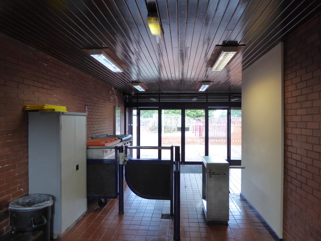 Inside the station building looking at the turnstile with the station front beyond:
