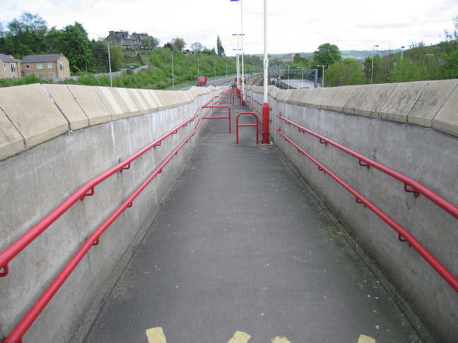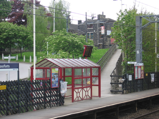 Crossflatts station is on the line betweeen Bingley and Keighley, and is an unexciting modern station built in 1982. At this point the line is right next to the A650 dual carriageway, but the station is accessed via the B6265 which crosses both the dual carriageway and the line. Looking south from the bridge at the station platforms: