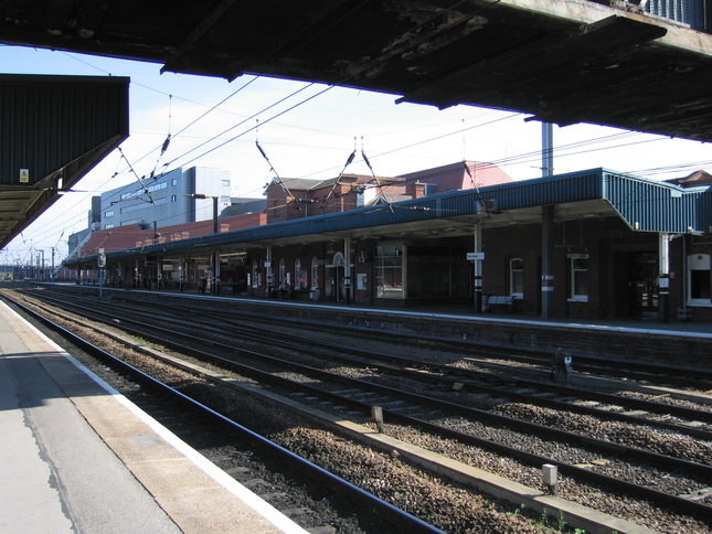 The opposite edge of this island forms platform 1. The roof of the station frontage can be seen on the left in the distance: