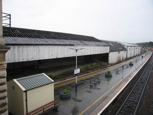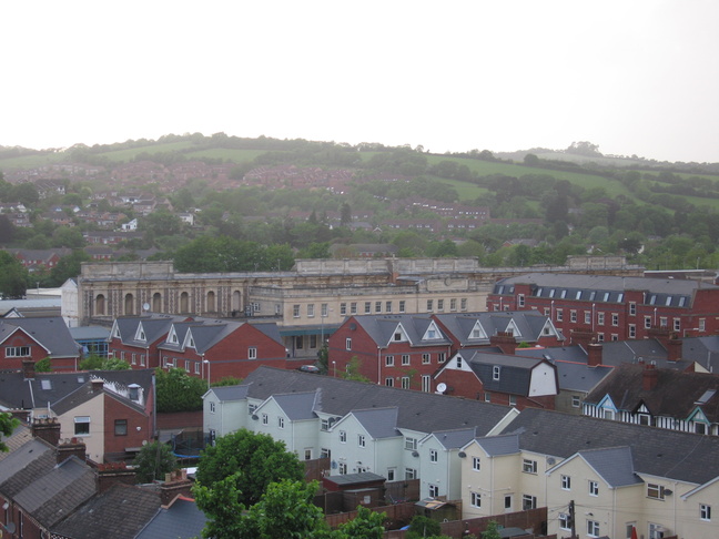 Exeter St Davids is the main railway station in Exeter, and lies at the bottom of the Exe valley down some steep hills. The local topography makes getting a good view of the whole of the station's long frontage is a bit difficult, but here's a view over the top of nearby houses: