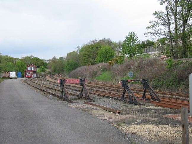 Looking north from the end of platform 2 we see a signal box and some sidings: