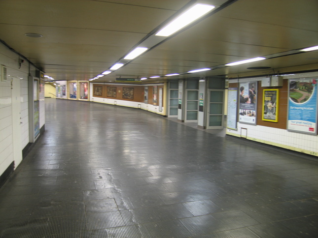 Escalators lead down from the ticket hall to a long subway which connects to the deep level Wirral line platform and to the slightly less deep Northern Line platforms. The entrance to the Wirral Line escalators can be seen on the right: