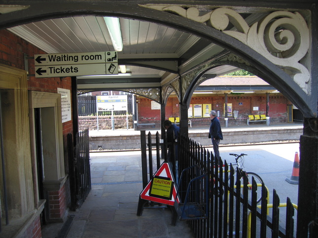 The entrance gives onto platform 2, but most of the doorways from the station building to the platform are blocked up. Looking east under the canopy on platform 2: