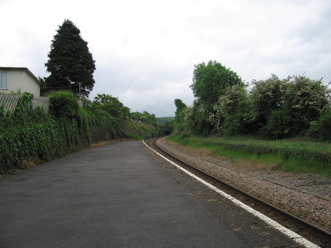 Looking north along the platform at Sea Mills, with the disused second platform visible on the left:
