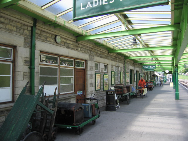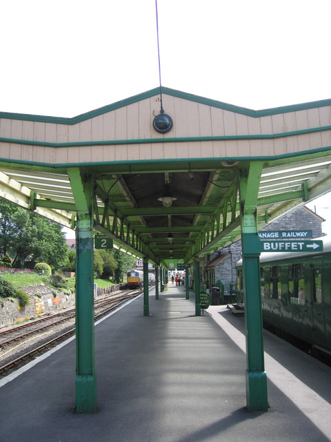 On the platform side of the building is a canopy, decorated (as with everything else along the line) in the Southern Railway green-and-cream colours:
