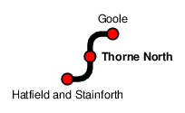 Thorne North station is one of two serving Thorne, and at the very edge of the South Yorkshire area our tickets covered. The line runs on an embankment and bridges a road (Field Side) to the south of the station. On the west side of the road bridge, there are steps leading up to platform 2, for trains towards :