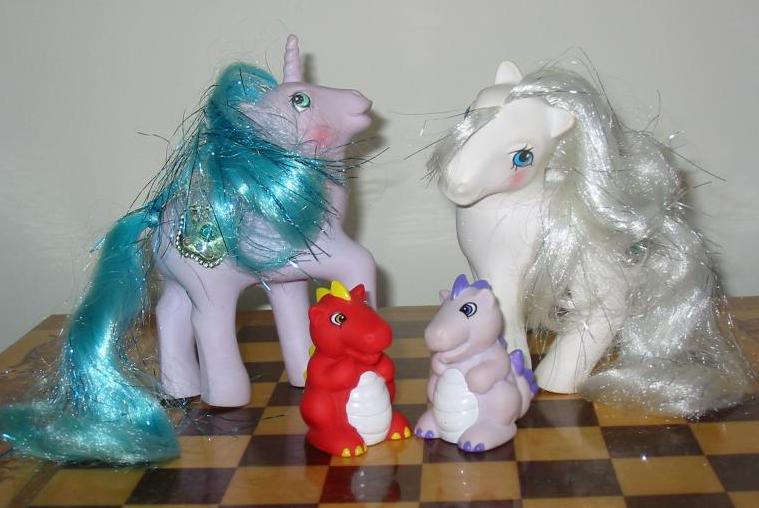 L-R: Princess Amethyst and Princess Pearl with their dragon helpers Spiny (purple) and Fiery (red). (US pony names are Princess Sparkle and Princess Tiffany).