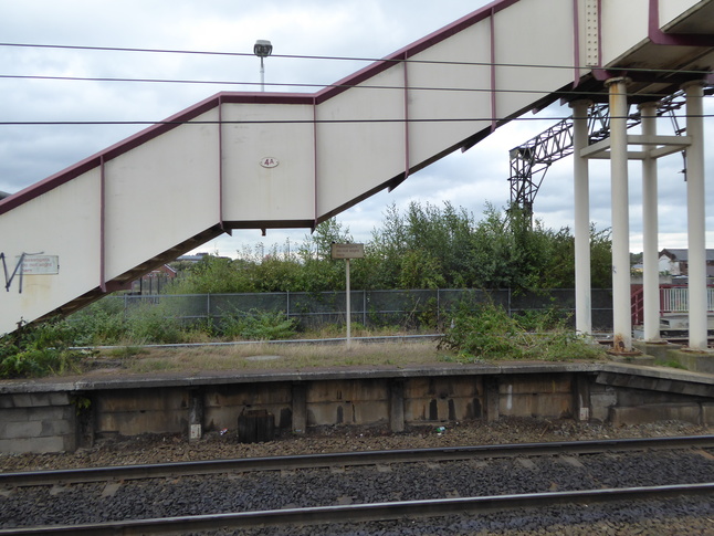 Looking at a stretch of disused platform under the footbridge leading to platform 2: