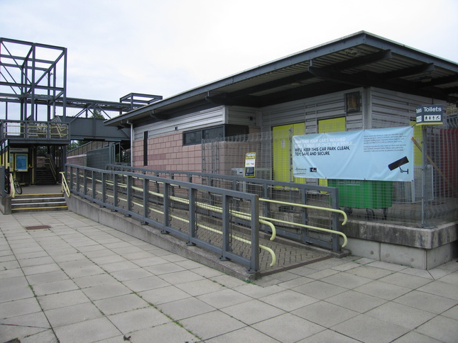 The station building with the steps to the footbridge on the left and the ramp to the footbridge just visible beyond:
