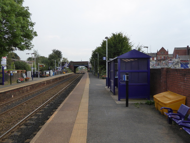 Looking south along platform 2, where the entrance is just beyond the shelter: