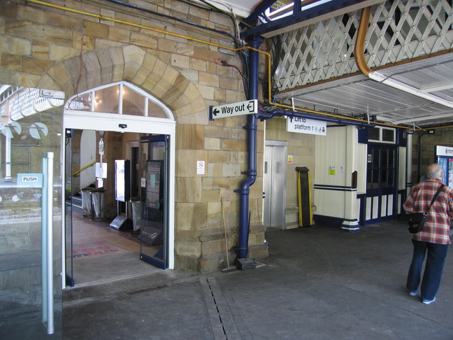 Out of the concourse onto platform 2 we can see the footbridge and the lift to it on the right: