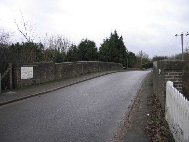 The road bridge itself, looking south along the road. The bridge is narrow so is made single-lane with traffic lights. Just beyond it is the bridge over the A14 whose noise dominates the area: