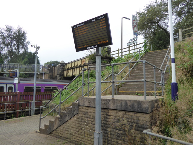 Steps lead up from next to the station building to the road bridge which crosses the line: