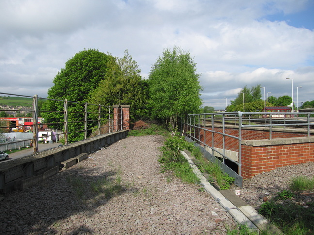 Looking west from the end of platform 1, with the old Ledgard Bridge Mill building (now apartments) on the left: