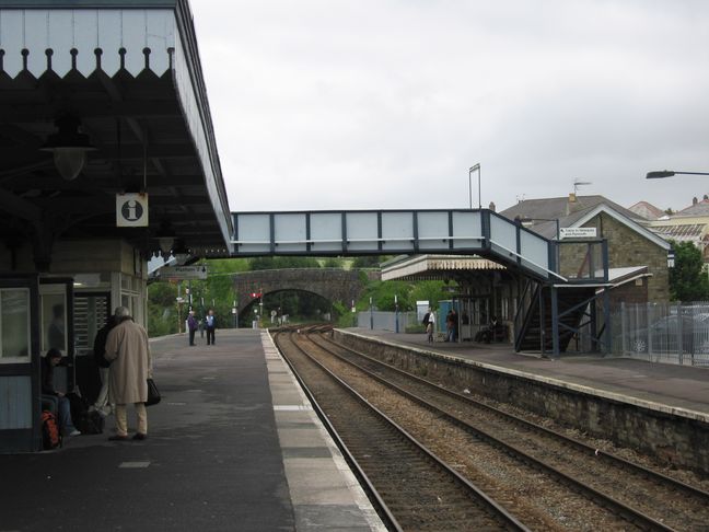 Crossing over the footbridge to the island platform gives this view under the canopy of platform 1. The small metal shelter is in front of a tickets window:
