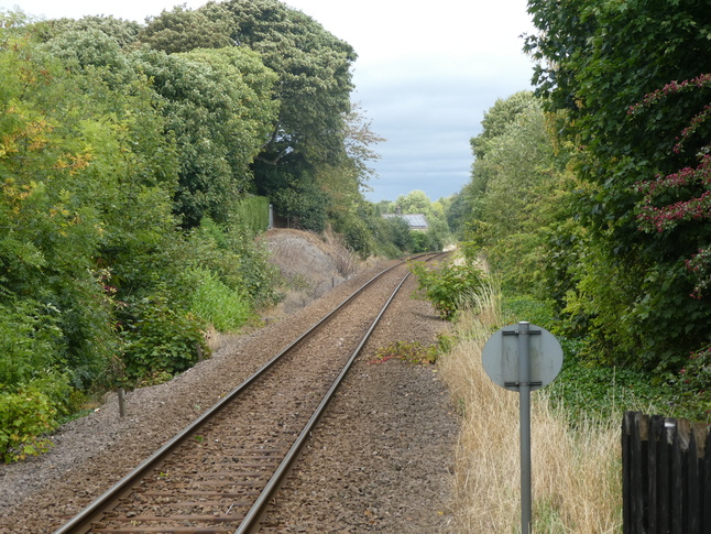 The eastern end of the platform bridges over Cone Lane, so we look south towards the village (and ultimately back down to the old Woodhead Route trackbed):